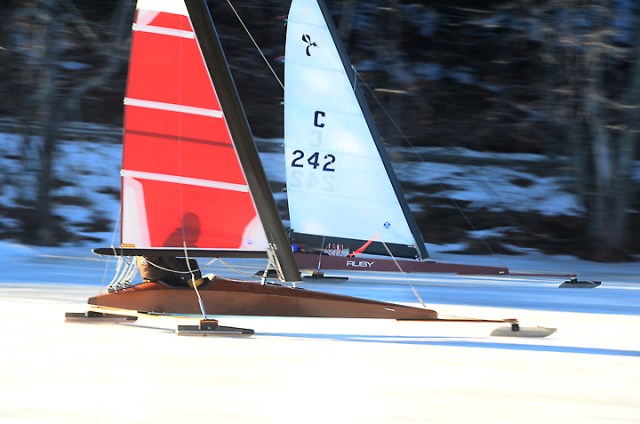 Doug Gaudet showed impressive speed upwind and down in the first two races, and led the series until the penultimate race, but as the wind built he lost his upwind speed margin – although he was blistering fast downwind all day. Going downwind was a challenge. It was easy to forget how sticky the ice was: gybing to too deep an angle would lead to near immediate stalling of the sail and loss of speed. There were lots of place changes, upwind and down.