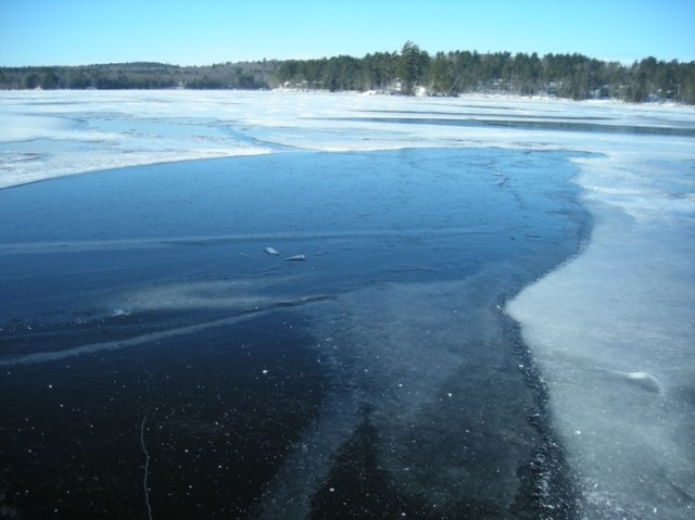 We sometimes sail on larger lakes with large areas of open water (we would rather not). Be wary not only of the visible water but also the likelihood of open leads extending away from the open water. These can be sneaky because your attention is drawn to the open water and you do not look in front of you.