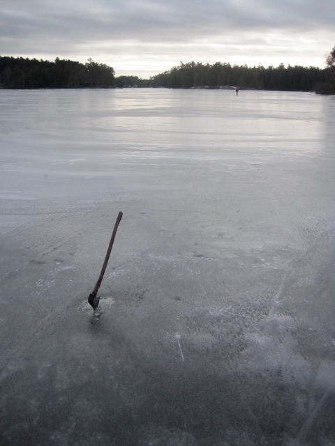 but ice that is punctuated also by danger: very occasional healed holes which slam you so soundly, that you are thankful to still have intact runners…or….out of nowhere, a house-sized drain hole, right in the middle of our playground, that we marked with an upright stick.