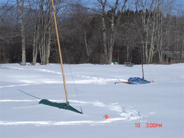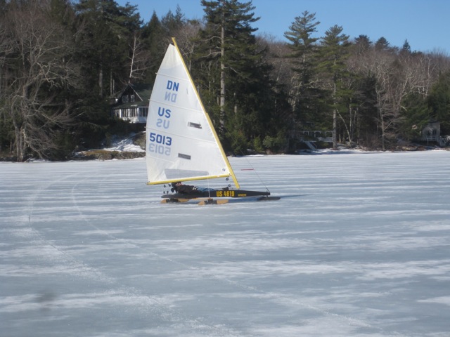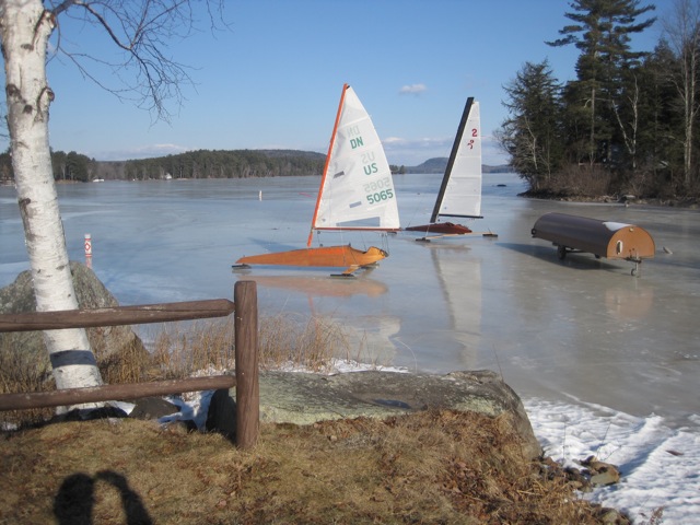 On Sunday the NEIYA will put on their long awaited DN Championship regatta on the same ice. The weather is supposed to hold with temps around freezing during the day and NW winds both days, perhaps gentle in the morning and picking up in the afternoon. The inn at Damariscotta Farm across the road from the launch site has some rooms left and serves dinner.