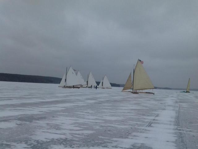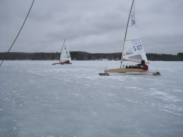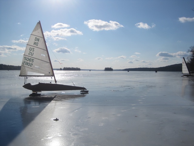 As we enter the millenium the club has grown to 50-60 members from all over New England. We are completely mobile, no one leaves their boats on the same ice all winter, we keep them at home, ready to roll to wherever the ice is. We sail on the best available ice, sometimes Chickawaukee, otherwise anywhere from Eagle Lake on Mt. Desert to Sebago Lake, and inland to Belgrade Lakes and even Moosehead Lake. We have a series of 5 DN regattas during the season and informal racing and touring any time.
