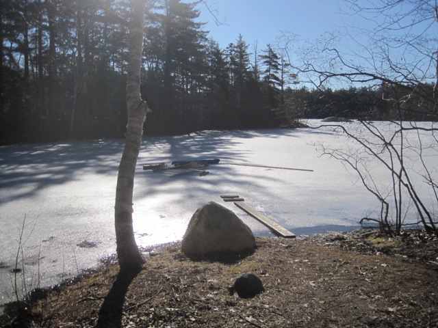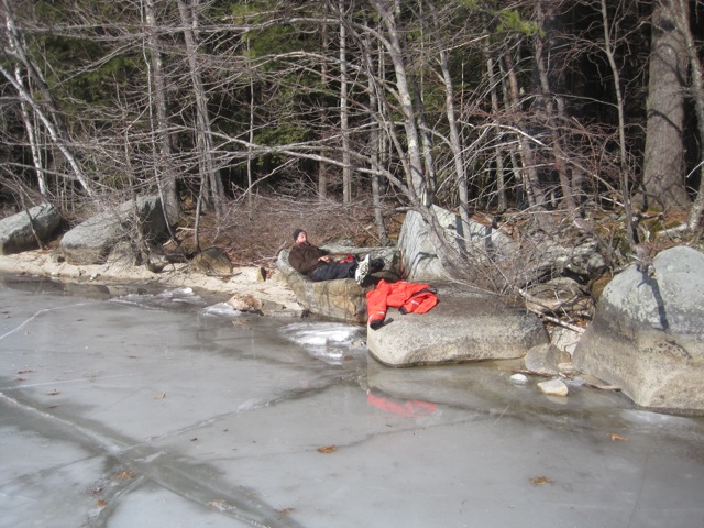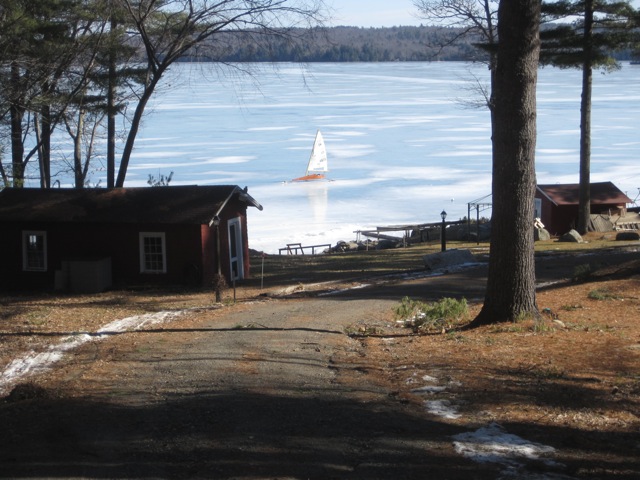 Late Spring sailing on Chicky is always limited by access. Public beach is gone. Lloyd’s lawn is slithery and beach will be gone shortly. Ice along Rte 17 seems to be up against steep rocky embankment and is tempting. I am very wary of that edge as it gets a lot of reflected warmth from the sun shining on its Western face. The water is deep there right up to the shore.