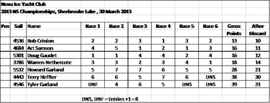 Thanks to everyone who made it- Especially Bob Crinion who made the trip from Nova Scotia to sail with us and Kristin Buckley for keeping score also the generous folks who kindly let us use the launch site.