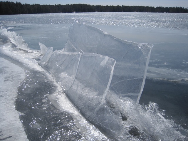 Ice expands sideways as it freezes until it buckles into wrinkles called pressure ridges or reefs. These are always dangerous as one edge over rides the other often breaking it into small pieces that will not support you or your boat. Usually a ridge can be crossed somewhere after exploration on foot. Never sail across a pressure ridge no matter how benign looking unless you have just seen someone else do it right in front of you, and even then use caution. Be aware that pressure ridges may change from safe to unsafe in minutes. When in doubt get out, park, and explore on foot. Sometimes “pressure ridges” pull apart, these open leads are especially treacherous, even if you “know where it is”.