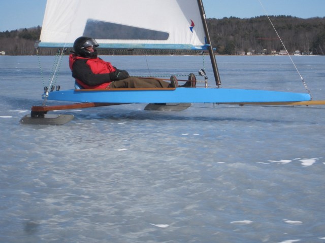Everyone arrived good and early as iceboaters should, and there was wind. Bob Crinion arrived from Nova Scotia after an all night solo 8 hour drive, making the Maine State Championships an international event. Sailors from as far south as New York and Maryland as well. NW winds blowing across the lake were a bit gusty/shifty and were backing to the west as the day went on. I am happy that Doug Raymond came to race, good to have at least two Mainers in the MSC. The boys from southern NE came with their speed, so the race was on. I was not up front so I can’t personally describe the action, but I do know that I suggested that we use the Bart rule! The BUMPY ice gave the leader T some problems with runner chock bolts loosening, but that was not enough to slow him down. It was funny to read what he put on the NEIYA site: “The ice was re-frozen snow or something and the ride was BUMPY but that is part of the game, isn’t it? If you didn’t lose any parts from you boat or fillings from your teeth you are set for awhile….” also from the winner: “Very physical sailing with puffs and lulls coming and going very abruptly- Big changes in direction also meant big sheet adjustments all day and lots of throwing weight around in the boat. And plenty of positions gained and lost!