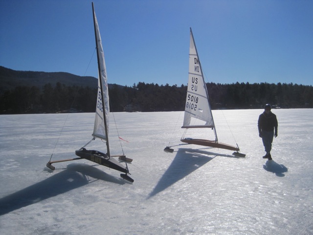 In the 80’s we began to be more mobile as the construction methods reduced the weight of the hull from 75-80 Lbs. to a more manageable 45 Lbs. We ventured off to the New England Championships in Massachusetts, New Hampshire, and Vermont as well as occasional forays to National and World contests and the sometimes incredible Winnie Spring Frolic (200 ice boats in a good year) on Lake Winnepesaukee in Hew Hampshire.