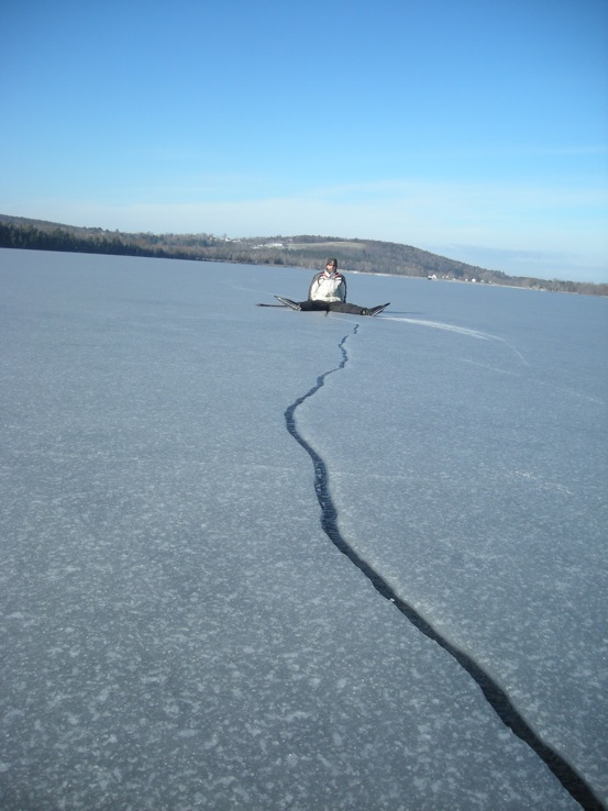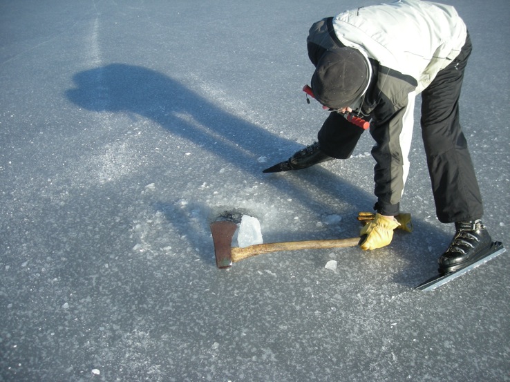but ice that is punctuated also by danger: very occasional healed holes which slam you so soundly, that you are thankful to still have intact runners…or….out of nowhere, a house-sized drain hole, right in the middle of our playground, that we marked with an upright stick.