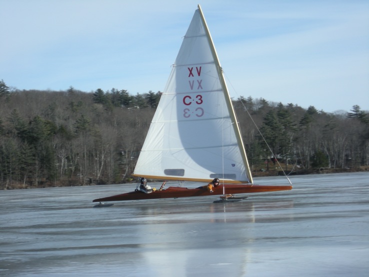 Maine has icy winters and ice breeds iceboaters. Iceboating in Maine dates back at least 100 years. The fishermen on the island of Vinalhaven took the small gaff rigs off their lobster “pinkies” and put them on runners for sport sailing on a tidal pond, and larger “stern steerers” were seen on many of Maine’s lakes. A small remnant of the Vinalhaven fleet still sails there.
