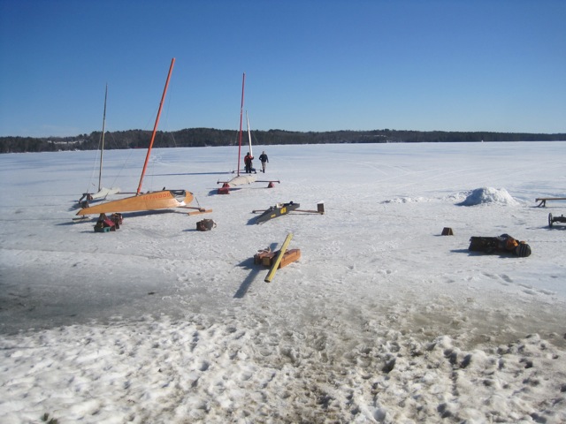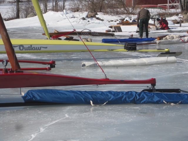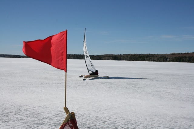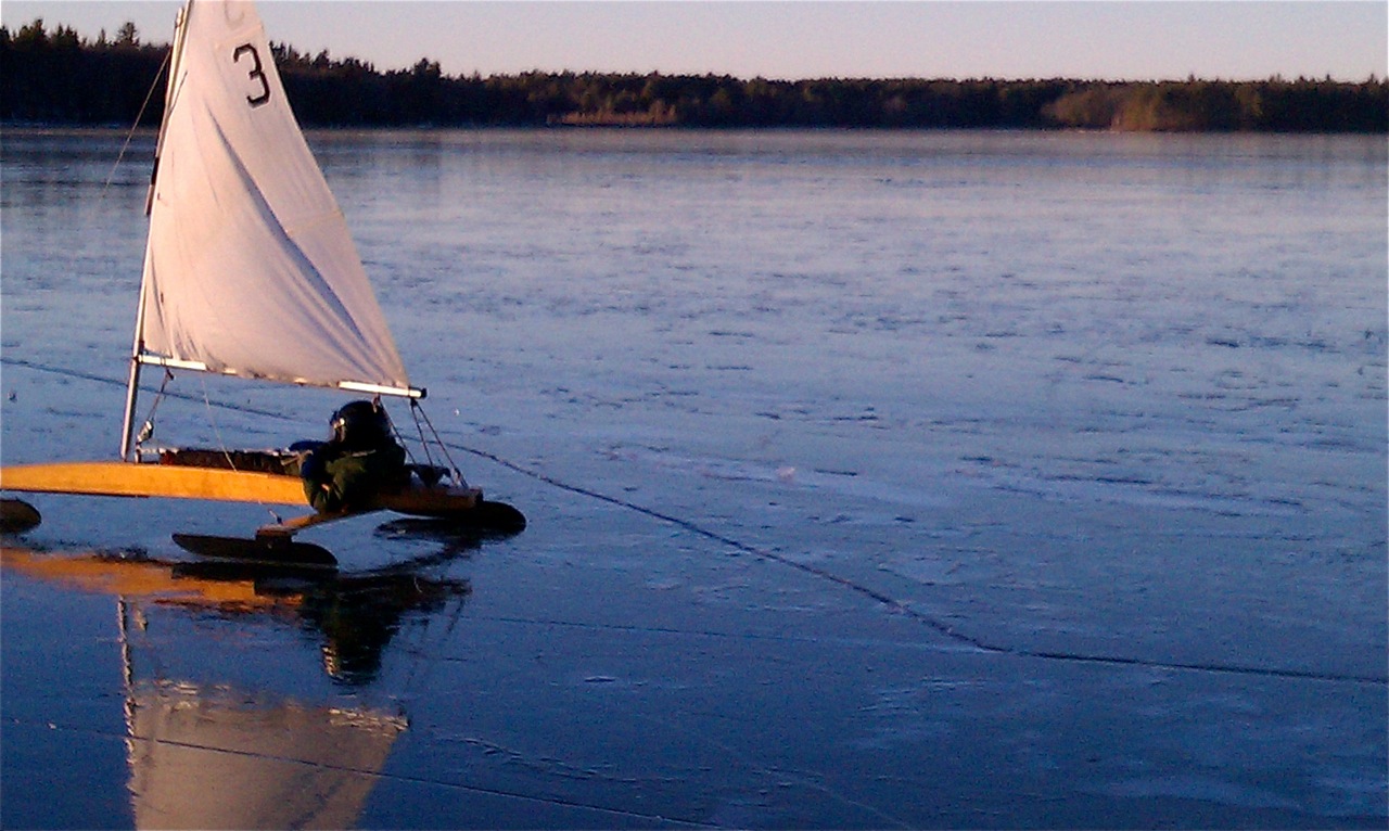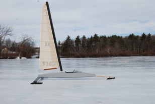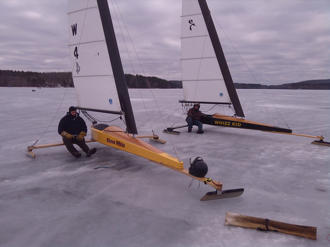 Everyone arrived good and early as iceboaters should, and there was wind. Bob Crinion arrived from Nova Scotia after an all night solo 8 hour drive, making the Maine State Championships an international event. Sailors from as far south as New York and Maryland as well. NW winds blowing across the lake were a bit gusty/shifty and were backing to the west as the day went on. I am happy that Doug Raymond came to race, good to have at least two Mainers in the MSC. The boys from southern NE came with their speed, so the race was on. I was not up front so I can’t personally describe the action, but I do know that I suggested that we use the Bart rule! The BUMPY ice gave the leader T some problems with runner chock bolts loosening, but that was not enough to slow him down. It was funny to read what he put on the NEIYA site: “The ice was re-frozen snow or something and the ride was BUMPY but that is part of the game, isn’t it? If you didn’t lose any parts from you boat or fillings from your teeth you are set for awhile….” also from the winner: “Very physical sailing with puffs and lulls coming and going very abruptly- Big changes in direction also meant big sheet adjustments all day and lots of throwing weight around in the boat. And plenty of positions gained and lost!