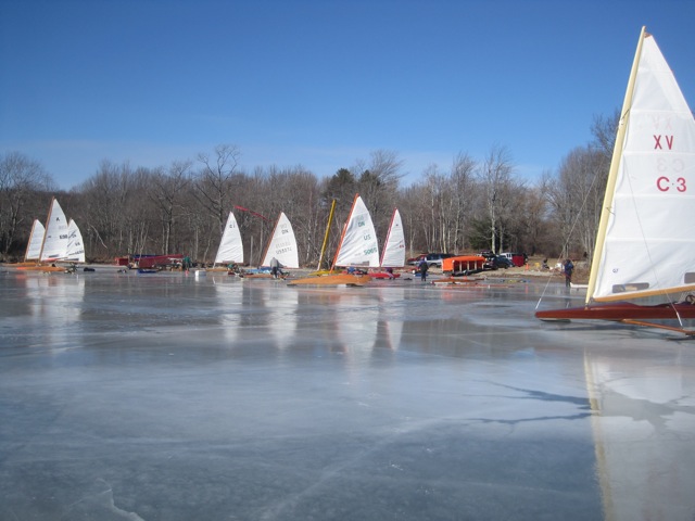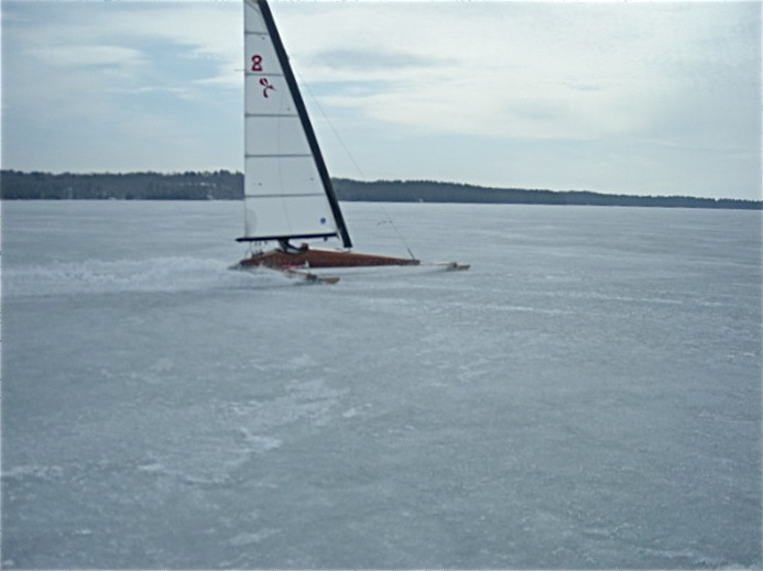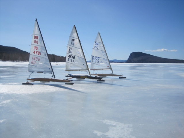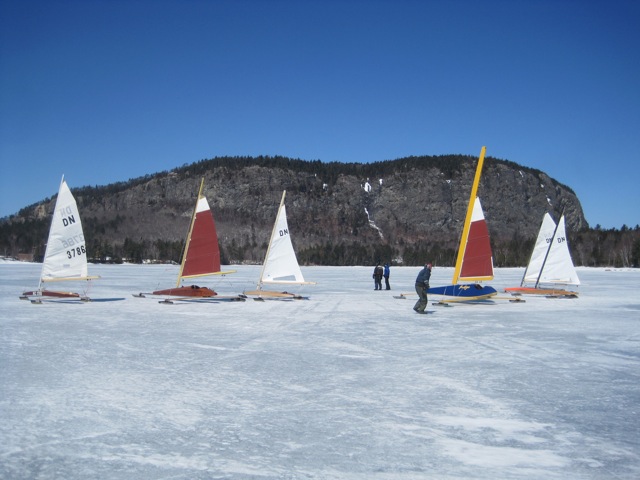 As we enter the millenium the club has grown to 50-60 members from all over New England. We are completely mobile, no one leaves their boats on the same ice all winter, we keep them at home, ready to roll to wherever the ice is. We sail on the best available ice, sometimes Chickawaukee, otherwise anywhere from Eagle Lake on Mt. Desert to Sebago Lake, and inland to Belgrade Lakes and even Moosehead Lake. We have a series of 5 DN regattas during the season and informal racing and touring any time.