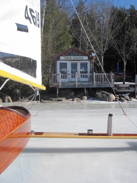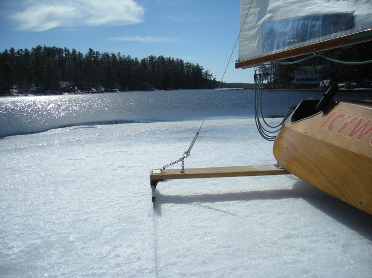 Late Spring sailing on Chicky is always limited by access. Public beach is gone. Lloyd’s lawn is slithery and beach will be gone shortly. Ice along Rte 17 seems to be up against steep rocky embankment and is tempting. I am very wary of that edge as it gets a lot of reflected warmth from the sun shining on its Western face. The water is deep there right up to the shore.