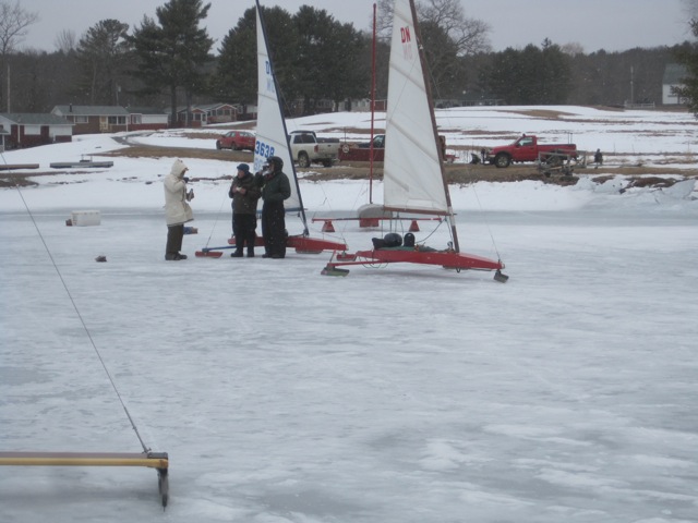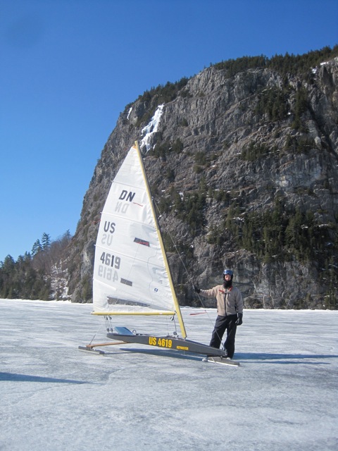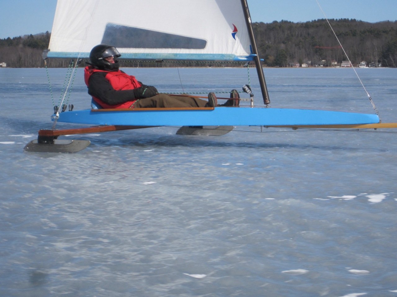 Some feel that racing is what iceboating is all about and spend all their time doing it, going around little red buoys like moths around a candle. Racing is very exciting, highly addicting, and the only way to learn how to sail an ice boat well. Get advice and coaching from the faster skippers, they will be happy to help you. If you have questions about ROW, ask. DN racing has gotten very serious, sophisticated, expensive, time consuming, and rather daunting to the new ice sailor who often states “I just want to sail”. OK, but that sailor will probably never learn to sail down wind in light air, which always seems where the launch area is at the end of the day. Informal racing is the key here, you don’t even need to think racing, just put out a couple of traffic cones for windward and leeward marks and sail around them. Lacking cones use fishing houses (with respect for tip ups and people. If you hit a tip up, stop immediately and re-emburse the fisherman.) The important thing is to break out of the easy pattern of just reaching back and forth all the time. It takes at least a season to get the hang of sailing down wind. Some never get it.