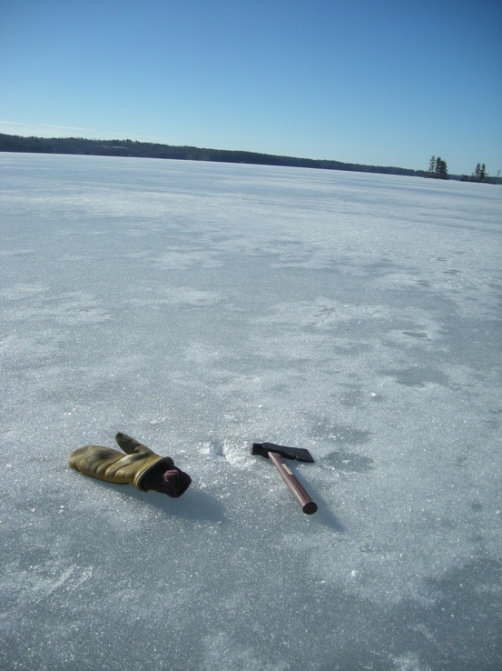Ice, wonderful stuff, not only presents many patterns, colors and textures which give it character, but it may be too thin, reasonably thick but structurally unsafe, have holes in it for no apparent reason, be pressed together into ridges, pulled apart into open leads, or simply absent in unexpected places. Blessed is the lake covered with a uniform sheet of ice with no defects. This lake is usually small, you don’t need big ice for a big time.