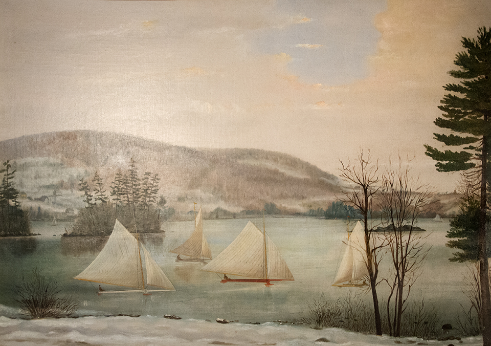 Also in the barn is Ann’s father’s magical summer gathering hall, which again was our meeting site. It was decorated for the occasion with numerous enlarged color prints of President Buchholz’s spectacular photos from the past season. They are available for any ice boating promotional event, and copies of any or all can be ordered through Bill. Jory’s hat was passed for contributions to reimburse Bill for his expenses.