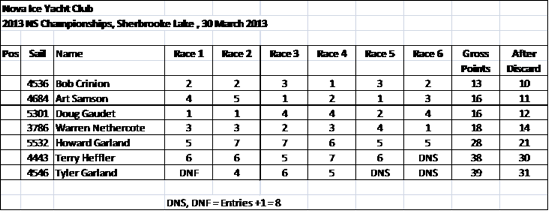 Thanks to everyone who made it- Especially Bob Crinion who made the trip from Nova Scotia to sail with us and Kristin Buckley for keeping score also the generous folks who kindly let us use the launch site.