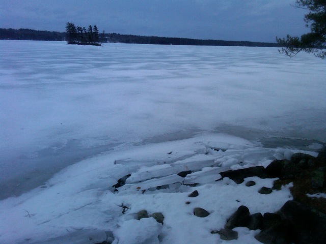 The open water and honey combed ice at my beach is now 5-6 inches of soft snow ice, no plank needed. 100Yards out under 6 inches of soggy snow, but not slush, there is dark dry black ice. I chopped and chopped this clear fairly hard ice and finally broke through still solid ice at 10 inches!! Where did the 2-3 inches of junky wet stuff on the top and the leaky junky stuff under that all go? No water welled up into the hole while chopping as it did about ten days ago when rain water just disappeared from the surface. This pretty good looking black ice contained no visible air and indeed after breaching the bottom the hole promptly filled with clear, not brown run off, water and overflowed onto the ice spreading out into the snow. Why hasn’t all the ice sunk and wetted out the snow? It seems to have sealed itself in the last week of cold weather and now it does not have buoyancy enough to hold up the snow.
