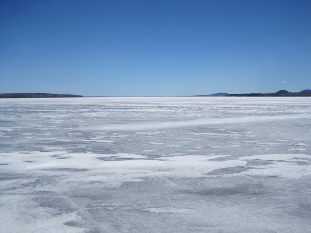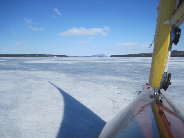 This is Mt. Kineo in the distance, our windward mark. The ice was as good as it looks in this picture. The roster: Warren Nethercote, Denis, Yves and Frank, Curtis Rinlaub, Lee Spiller, Bruce Brown, Kate Morrone, Dave Fortier, myself, and the hard-core bros Lamb and Coward.