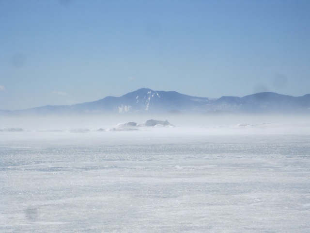 Yes, that’s a pressure ridge hiding in the white-out. There were five pressure ridges between Greenville and Mt. Kineo, all easily crossed, some under sail once scouted by the first boat. The ice was very good, probably a 7. Peter Coward spent some time on a particularly fine plate doing speed runs while the rest of us were trying to keep our speed down! Denis Guertin’s brother, Yves, did the whole trip in a DN with a full sail and kept us amused with his gymnastics. He is an excellent athlete.