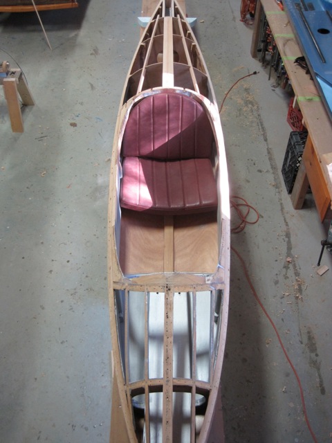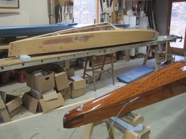 So Touch became Ouch and the long skinny bow was Gone. The cockpit was reversed and lengthened, the bulkheads ripped out, side boards pulled in with a new sheer line struck, and new bulkheads and mast step installed. The spring board is internal, and she has a 16′ airfoil section runner plank.