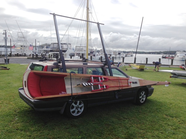 And speaking of heavy gear, check out this roof rack system. Mike is in a curious situation in that the ferry from Long Island to Connecticut charges a small fortune for hauling a trailer, so LI iceboaters wanting to sail on the mainland are limited car topping. But this cool rig might find broad use, especially if you can pull into the garage, disconnect the rack from the car, and hoist the whole package overhead.
