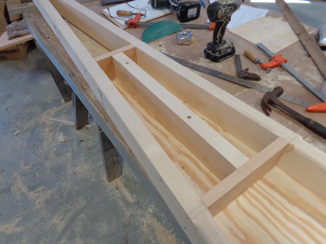 Forthwith turned out to be 4 hours for the bare fuselage, the big bang. The space time continuum expanded exponentially to five days and $150 worth of materials, lumber yard 2 X 12, a bag of 3/8 ordinary shiny bolts, not even hot dipped galvanized let alone stainless, Titebond III glue, no epoxy, bits of plywood from around the shop, bed frame rails from the dump for runner angle steel (much harder than cold rolled), aluminum plate bits from the junk box, and a hand full of wood screws.