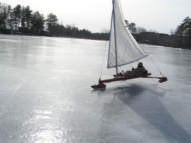 The Alcort Sunfish empire began with a commercially unsuccessful ice boat design, some 50 boats made in the early 1960’s. CIBC member Al Heath bought one from Uncle Henry’s some years ago and has been sailing it hard and maintaining it little for many seasons. It sails well with un-modified Sunfish spars and sail, and is made from a few sticks of wood, ply, nuts and bolts, and angle iron runners.