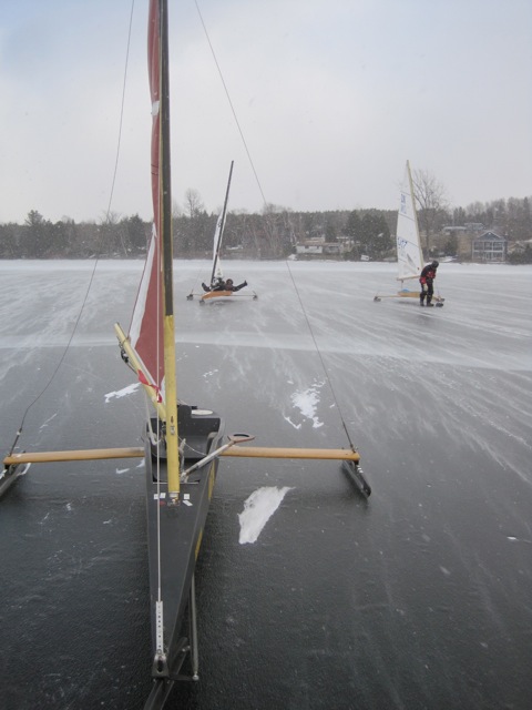 I found Denis and Frank on Petit Lac Lambton in an easy four and a half hours, including a search at the border. The Canadians did not believe one could be ice boating so early in the year so must have felt I was hiding something under all those sails and planks.