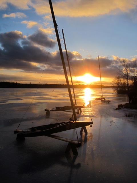 No, not our beloved ice-making weather system, but the buzz of first ice with good buddies. Rules of Thumb say not to drive excessive distance to ice that hasn’t been sailed, but there is also the “show up and pray” clause. Invoking the latter, based on the bubbly optimism of Denis Guertin I headed for Quebec long before dawn yesterday. He wasn’t sure where we’d be sailing but he promised ice somewhere. As we’ve been feeling the pinch of a late starting season it seemed to be a worthwhile gamble. Besides, the NEIYA racing gang had driven all the way to Wisconsin this weekend; my little jaunt across the border paled by comparison.
