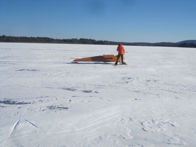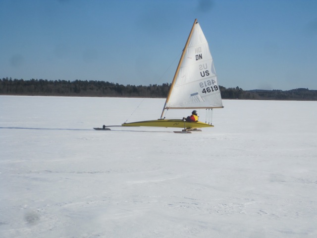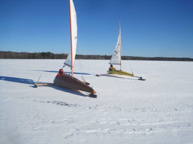 Somedays you have great ice, nice breeze, sunshine and a fun bunch of iceboats cavorting around a beautiful lake. Aligning all those disparate elements can actually be called iceboating. The sailing part is just the frosting on the cake. And speaking of frosting: the six inches of Plymouth ice was frosted with an inch of light unbonded snow this morning at ten. Jory and I walked halfway across to where we knew there was thin ice a week ago but found nothing but thickness. But the 15kt breeze was working on the snow, packing into tight little drifts. Scott Woodman and Jory set up their boats anyway and had a go at the snow.