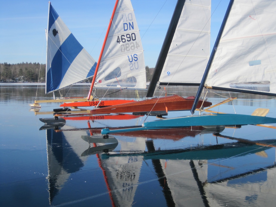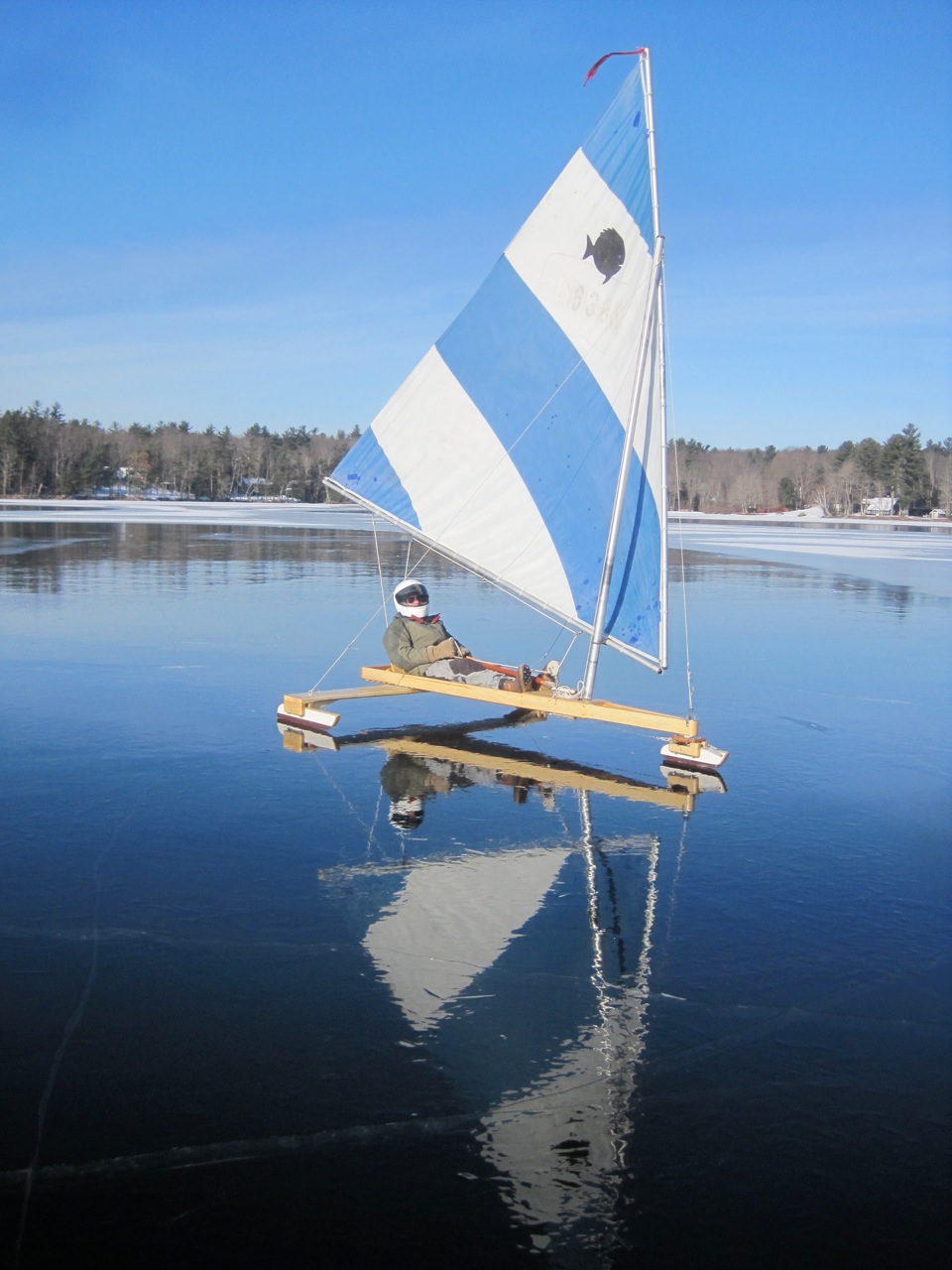 But many of the die-hards were there: Lloyd, setting up his new ‘cheapskate’; Bill, setting up his Wizz for the first time this season; Dave Fortier and Jim Gagnon in DN’s; Karen and Lee on skates, with their Gambit set up nearby; “Wolfie” on skates, who was away last year; and our frequent nordic skater buddy, Marty. I put on skates and headed for the first black ice patch; then proceeded South following leads of grey snow ice…..until…..until…there it was: a 1.2 X 0.3 mile plate of perfect black ice.