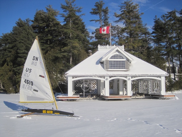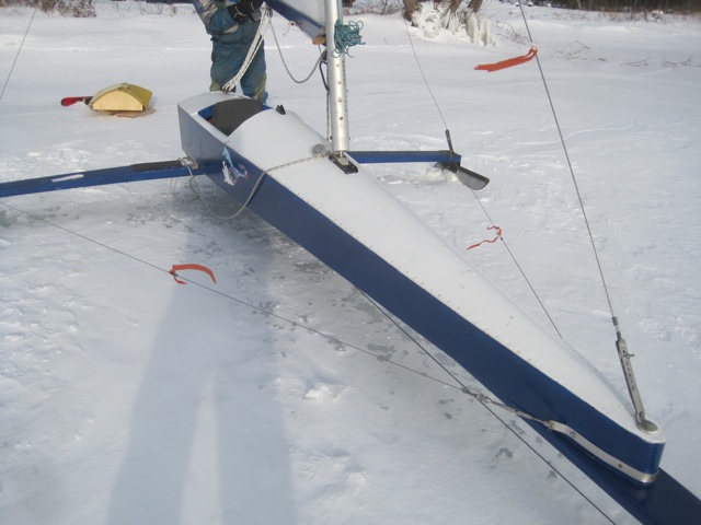 With a date like 1-4-14 how could you go wrong? All the pieces fell neatly into place for an epic sail on Saturday. The forecast light wind built to a fine 10-15 from the south just as we finished setting up, and the south wind brought a breath of the tropics, boosting the mercury above zero. Amazing how good it feels to go from -15 to +3. Day finished at +10. Were we cold? Of course we were! But we kept going until the headlights of the cars leaving the ice indicated night was coming.It was the three of us in the video below, as well as super DN, a gaggle of kite sailors, and a local Skeeter: a hybrid Whizz/Nite. From the cockpit forward is built from the DN Goodchild Whizz drawings, and the stern from a Nite but narrowed to carry one person.