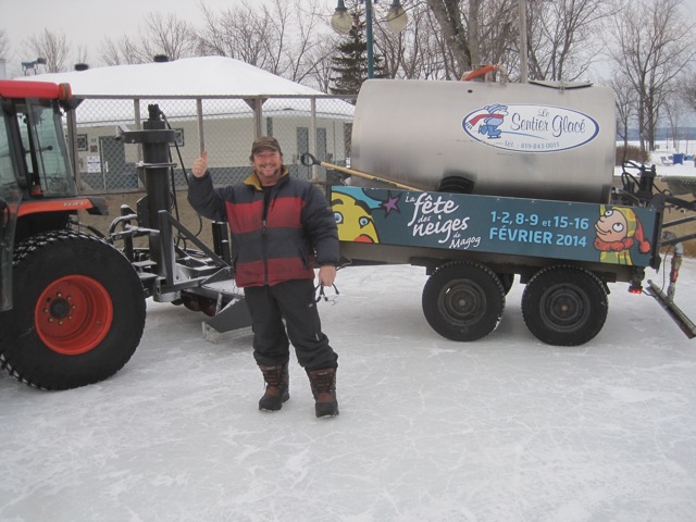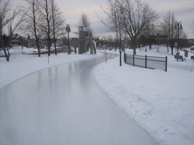This morning the wind had vanished and the snow had softened, so we went for a skate on the municipal skate trail which winds along the shore at the head of the lake. It had just been Zambonied with a rather crude rig, but the results were superb. “Magnifique” I told the guy and he seemed pleased.