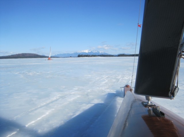 South Twin last year, with Mt. Kahtadin in the background. We’ve sailed only a small part of this vast system because by the time we usually get there in March the northern end has blown out. Tomorrow, with solid intelligence from the snowmobilers, we may be able do as MLK, Jr. did and “go to the mountain!”