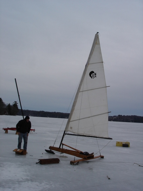 The photo below is Doug Raymond with his vintage home made Cheapskate, somewhat smaller than our current model and sized to fit into his Volkswagon with NOTHING hanging out (take note Squibb). It sports a “Sunfish II” sail, I believe a small Laser sail. The runners are welded up plates. He did not get to sail because of steering problems. It is cute. How small can ice boats get and work?