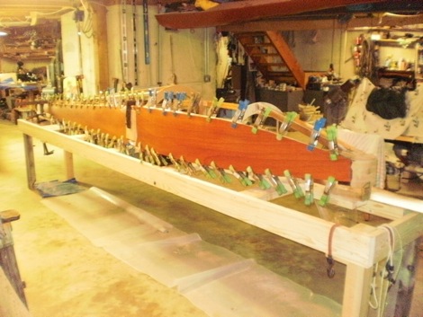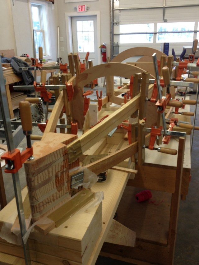 This is a good shot of the kerfs in the stringers that allow you to pull them in and down (and the chines up). Note also the nice radius on the chine in the cockpit. It’s nice to have a soft corner to bump into a you’re bouncing around on rough ice, like today on Damariscotta for example. W-3 Whizzard bottomed out of a pile of frozen stuff today and put a crack in the bottom.