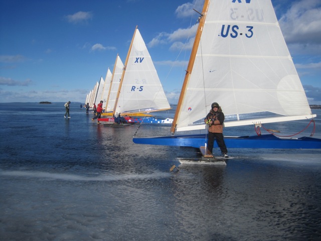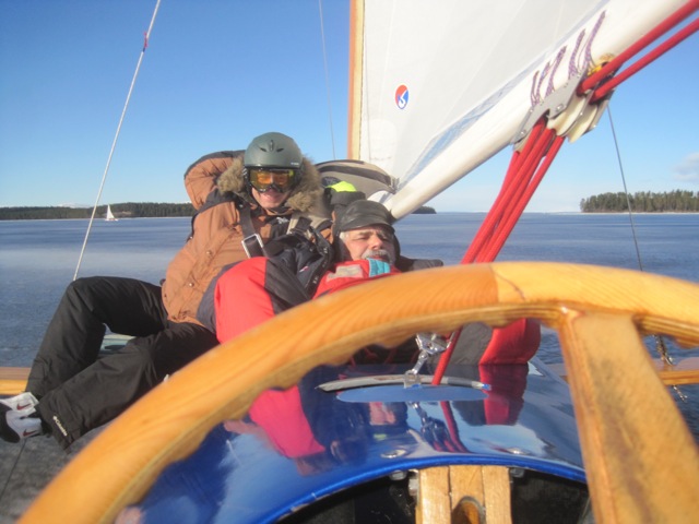 We had a lovely long downwind sail back to the pits, which I drew out as long as possible. We had to take back our pit crew boss Boris; he didn’t fit easily into the cockpit, while Dimitri rode on the plank. A fairly intense package in 25kts. But the sun was warm, the ice was still hard, and the scenery spectacular. In the distance are the snow covered mountains of Norway. I sailed us a couple of extra miles to the ferry’s open fairway before gybing around and heading for the pits. I has a feeling we were done for the day and wanted to get as much as this as possible. Indeed, two hours later racing was called for the day.