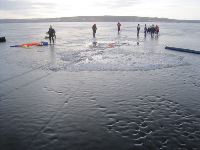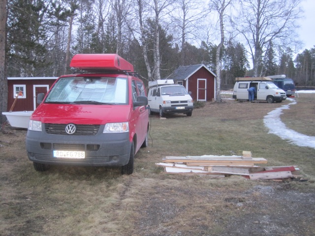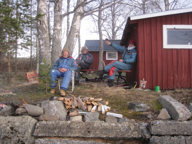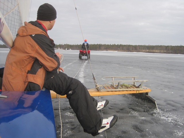 These guys are retired, most been sailing for years. This is the furthest north they’ve had to travel; generally Poland or central Sweden have fine ice this time of year. We have our own ice gypsy, Ramblin Rodger from Maryland who mysteriously shows up every now and then. This year he started his season in Canyon Ferry, MT. Like Rodger, these guys live in their vans, cook both alone and communally, a make long tours in the morning, come back for lunch and a nap, and then do it again in the afternoon. One very nice detail I noticed, and it can be seen on the guy in the photo on the right, are rubber patches on the knees. How often are we kneeling on wet ice, or a bit of snow? Not sure I’d go for the tire patch red, but a section of inner tube might be just the right shape.