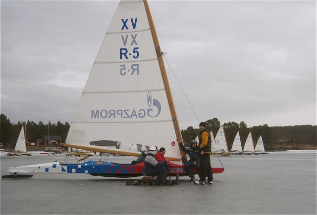 Igor, Gennady, Sasha (first place) and Igor’s son, George, at Igor’s boat, not really rushing to get off the ice: every iceboaters comfort zone.