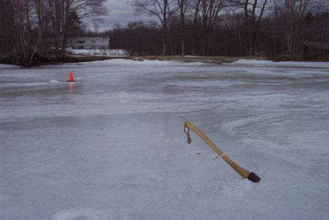 About 4 inches of firm slush everywhere over 18 inches of base ice, much of it black and transparent. By Saturday AM Temp mid 20’s there was 1 1/2 inches of ice over remaining firm slush. Nice surface.