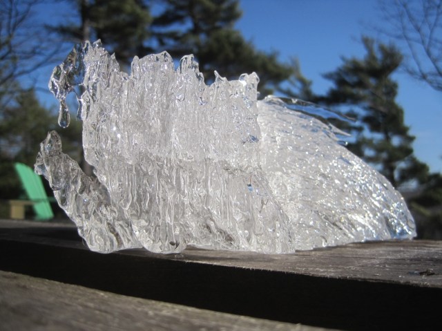 Here is a fascinating bit of ice crystal. The vertical part is the usual rotten formation and I believe the curving part, with horizontal crystals, is an ice fishing hole. They always freeze differently from the surrounding ice and now we see the crystals behaving oddly, like they really want to go vertical but just can’t get with the program.