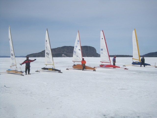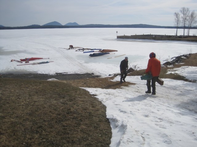 Dogs just need to be dogs. If there is a scent, it’s not possible for them to ignore it so they give chase. So it appears to be with iceboaters. We sniff ice and there’s just no way to sit still and ignore it. Even if there’s already been wonderful “end of season” sails with all the attendant drama of setting out planks, and wading through slush and self congratulations on how lucky we were to get this particular day. Just over the horizon is a tremendous plate of ice, the biggest in Maine, just waiting for a surface. Three to four feet of shore bonded ice on one of the most dramatically beautiful lakes in the east, with all due respect to Winnepesaukee and Champlain.