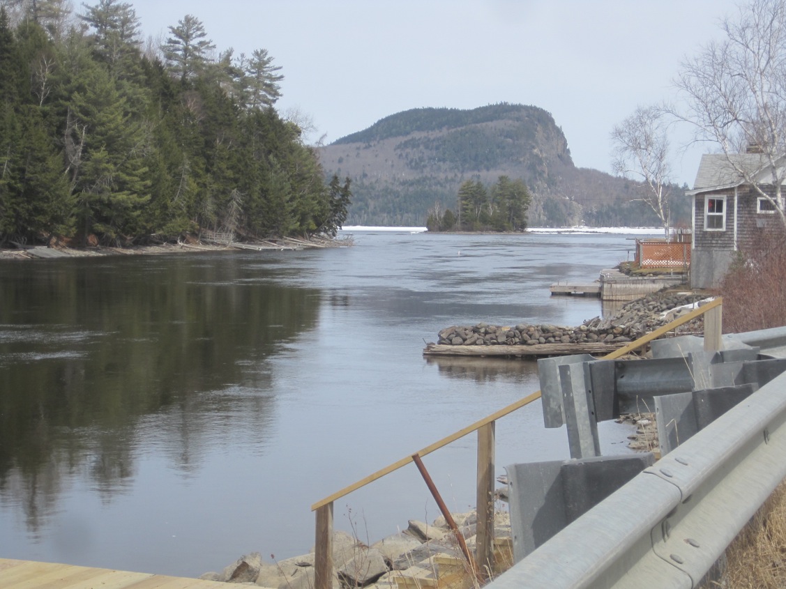 There’s a half mile of ice between the mouth of this river and Mt. Kineo. The big question now is what to do about all that ice. Rain is forecast for tomorrow which will wet out the few snow drifts and help compact the slush. The slush itself is very thin, maybe a half inch, with fine hard ice just under. Do we keep an eye on it like the dog on a bone just because he’s programmed to? Do we listen to the fat lady and walk away? It will only take another couple of cold nights to provide a good surface. Is there anyone out there who doesn’t want to bury the bone of this season, but who wants to continue chewing on it? Right down to the very marrow? Que sera sera.