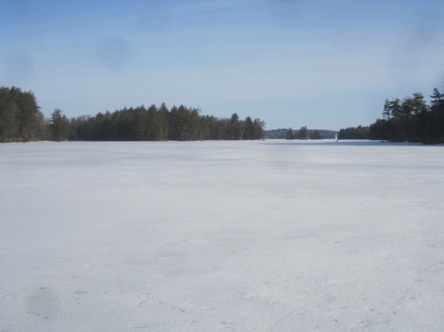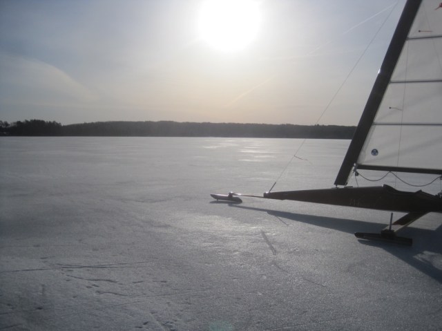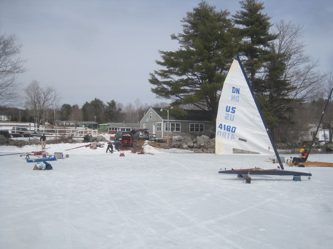 The plate had many glassy spots that looked and felt like real ice, here in the morning sun, but everything softened at about the same rate. By noon it was topping forty degrees, and with the light wind not even slush runners could provide the ride. But the day was so pleasant that no one was in a great hurry to pack up. We snacked, chatted, slowly took the boats apart and just tried to drink a deep enough draft of frozen Damariscotta to tie us over until next year. She came in late, but did not disappoint. If iceboating is the oyster in our lives, then this lake is the pearl.
