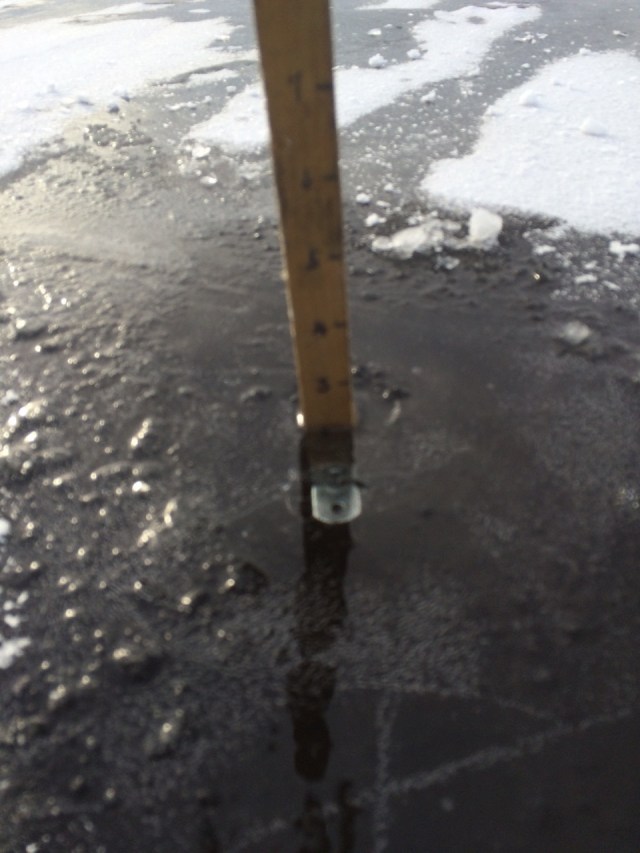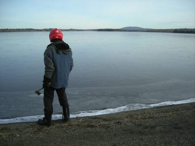 The ice on Plymouth Pond that Bryan Hitchcock found for us last week managed to survive the warm weather over Thanksgiving. The edges melted in places but they are now buttoned up again. By walking very lightly we were able to get thickness samples from the old ice of about an inch. There were slivers of open water in the distance.