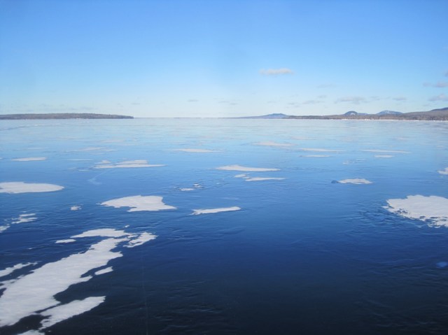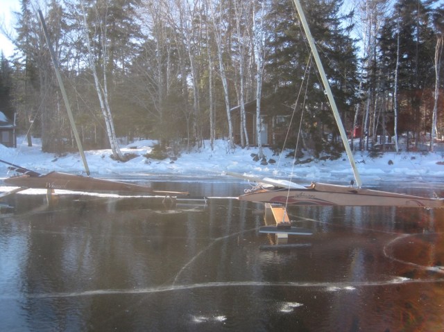 Kudos the Ramblin Roger, who set up at the Rockwood ramp, for actually sailing over the brash ice separating north and south, over which I wouldn’t have dared even push my boat. Then he took a nice three mile down-wind walk in the rising moonlight to fetch his van from the old launch site and drive back in time to join us for dinner at The Birches. And two tips of the helmet to Brett and his mom Helen, who drove all night from New Jersey. They popped in to say hello as we were eating breakfast and then went directly to the ice to set up. I believe they were still sailing well into the afternoon. Their exploit destroys all excuses!