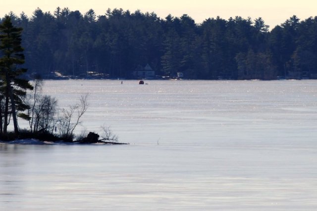 Bryan Hitchock sent a photo from the Dammy launch ramp showing a fish house and pedestrian out in mid lake yesterday. No ice firshermen have been seen out away from shore on Chicky all year, no doubt leery of the large expanse of open water that has been there 1/2 way down the lake all winter through some good cold nights.