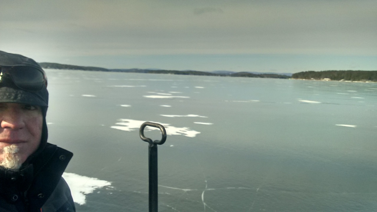 Lee Spiller ventured out on Lake Winnipeasukee this afternoon from Ellacoya to find a uniform 4″ plate. It extends at least from Rattlesnake Island north into the islands. Below is a photo looking north; I believe that’s Welch Island on the right. He thought there were some open holes further out, but we’re waiting for confirmation if he ever comes back! Even if the full extent of the plate isn’t known, he says what he scouted is plenty big for sailing.