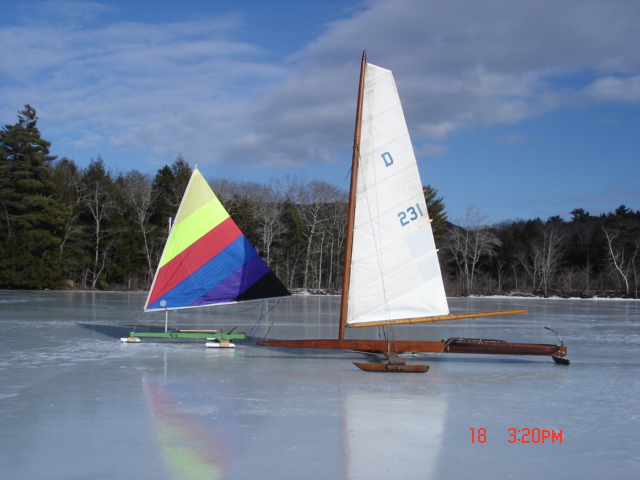 Assembly only took a couple of hours with intermittent help for unloading, mast erection, and sail raising. The ice was nice, wind brisk at times. With Buchholz at the helm and doing starting pushing, Roberts on the sheet, she pulled away sedately and tracked nicely across a mixed surface of silent ice and rumbling broken junk patches. The sail set nicely and non critically but not looking very historic with its square top and all that unused boom (about half) trailing behind. The ride was majestic with a modest turn of speed, probably 20 plus MPH. Twice the sail area or heavy air would likely have given sprightly performance.