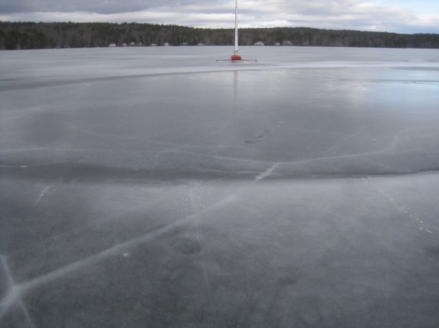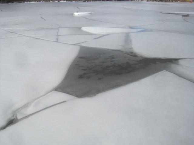 The only hazzards in the main body of the lake that we could find are drain holes, and this one large patch of black ice on the approach to the narrows which looked very suspicious. Bunting was good enough to stress test it for us. Suffice to say that he’s still dry: