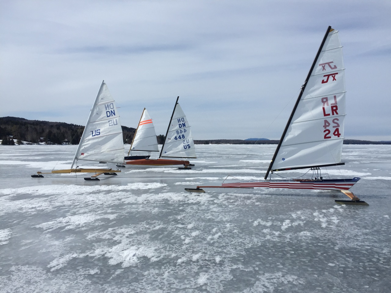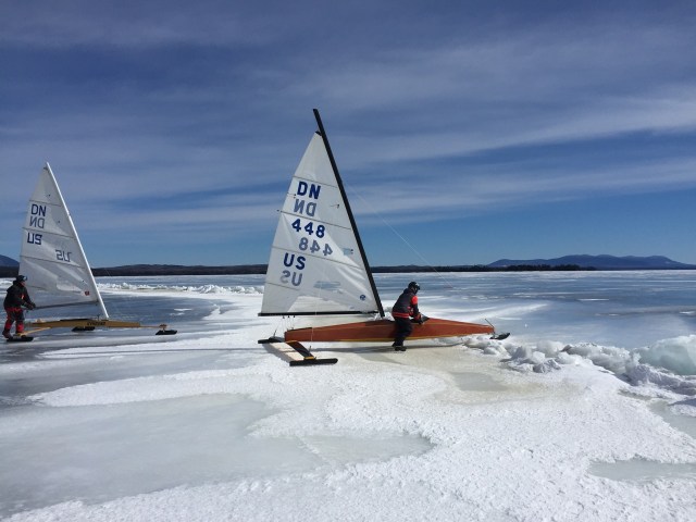 I must apologize for assigning a 10+ to Bob Lombardo’s ice report yesterday. I just couldn’t get out of my mind last year’s magic. It was actually a bit rough, and by mid day cracks were opening up. We still had a nice breeze and a decent sailing plate area until the ice began to soften. The white snow ice was especially soft, but the shades and patterns of whites and grays were beautiful. There were large areas that could have been flattened frozen zebras. Fred Muser had his new Nite dialed in and gave Bunting a good run for his money. Ryan Haskell, Dave Godine, Bobby Able, Bill Weigman and myself rounded out the fleet.